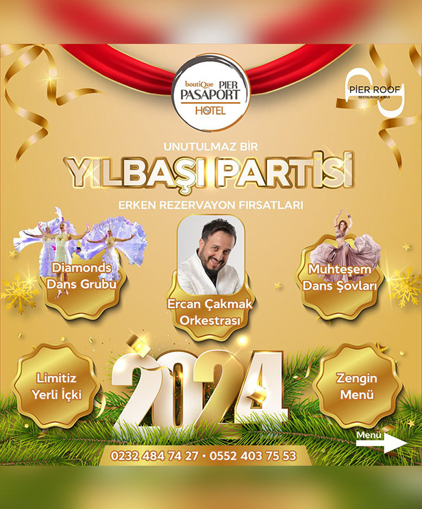 Pasaport Pier Hotel Restaurant, muhteşem bir yılbaşı partisiyle 2024’e merhaba diyor! 31 Aralık gecesi, İzmir’in eşsiz liman manzarasına hakim Pasaport Pier Hotel’de, unutulmaz bir geceye davetlisiniz. Ercan Çakmak Orkestrası ve Diamond Dans Grubu Showları ile geçecek bu özel gecede, yılbaşının coşkusunu en üst seviyeye çıkaracak bir program sizi bekliyor.