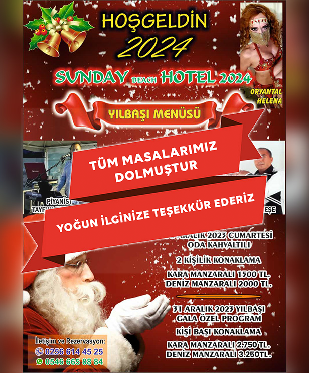 Kuşadası yılbaşı programlarına damgasını vuran Sunday Beach Hotel, bu yıl da konuklarına eğlenceli bir gece sunmaya kararlı. Canlı müzik, lezzetli ikramlar ve eşsiz bir atmosferle dolu bu özel geceyi kaçırmamak için hemen yerinizi ayırtın. Sunday Beach Hotel, sizi yepyeni bir yılın enerjisiyle buluşturacak ve unutulmaz anılar biriktirmeniz için sıcak bir karşılama sunacak. Yeni yılı kuşadası’nın en keyifli adresinde karşılamak için şimdiden rezervasyonunuzu yapın!